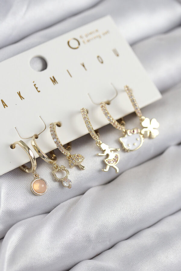 Tegan Pirinç Zirkon Taşlı Hello Kity Ve Yonca Model Gold Renk 6’lı Küpe Set TG27BKP11206