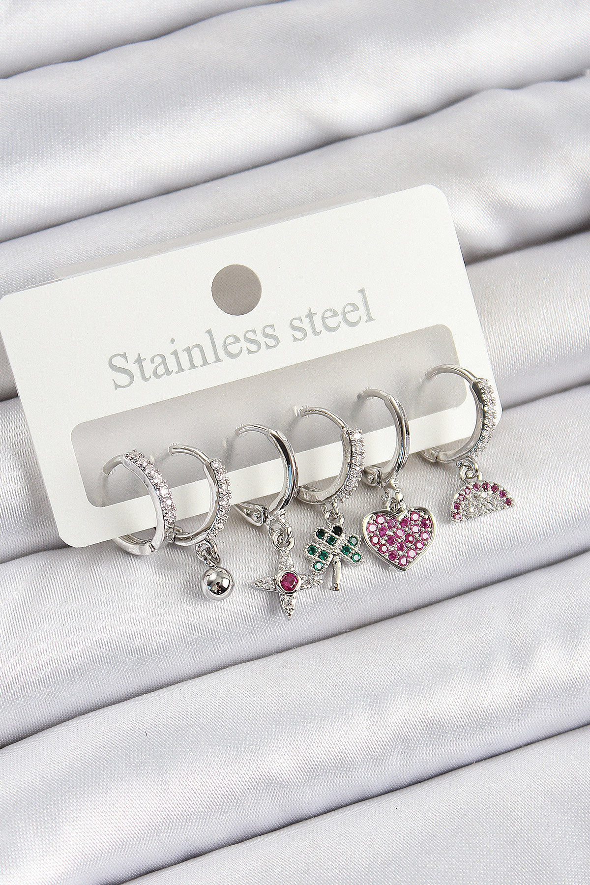 Tegan Pirinç Zirkon Taşlı Karpuz Yonca Kalp Pusula Karışık Model Gümüş Renk 6’lı Set Kadın Küpe TG27BKP10757