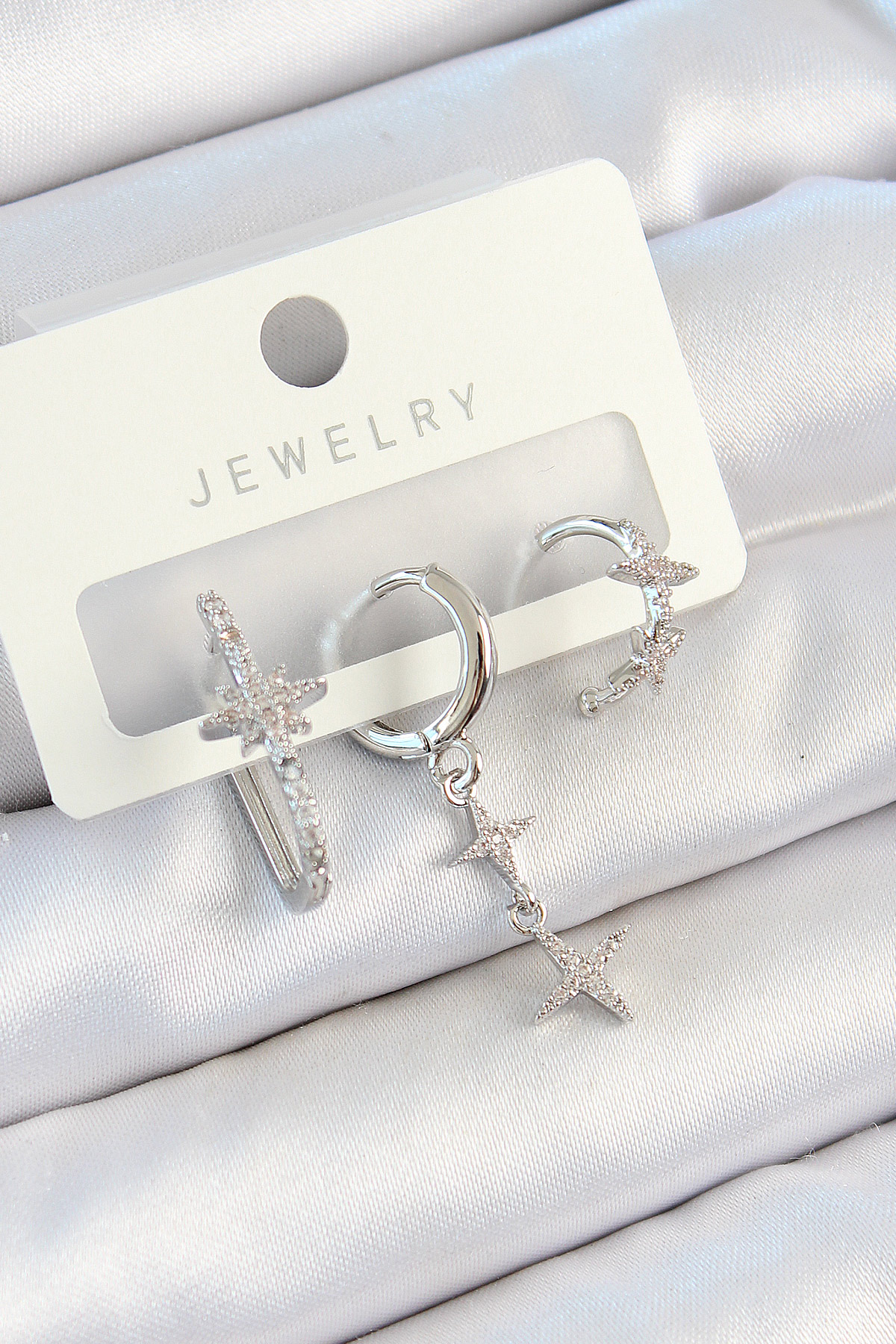 Tegan Pirinç Zirkon Taşlı Kelebek Ve Sallantılı Yıldız Model Gümüş Renk 3’lü Çift Kadın Küpe Set TG27BKP10811