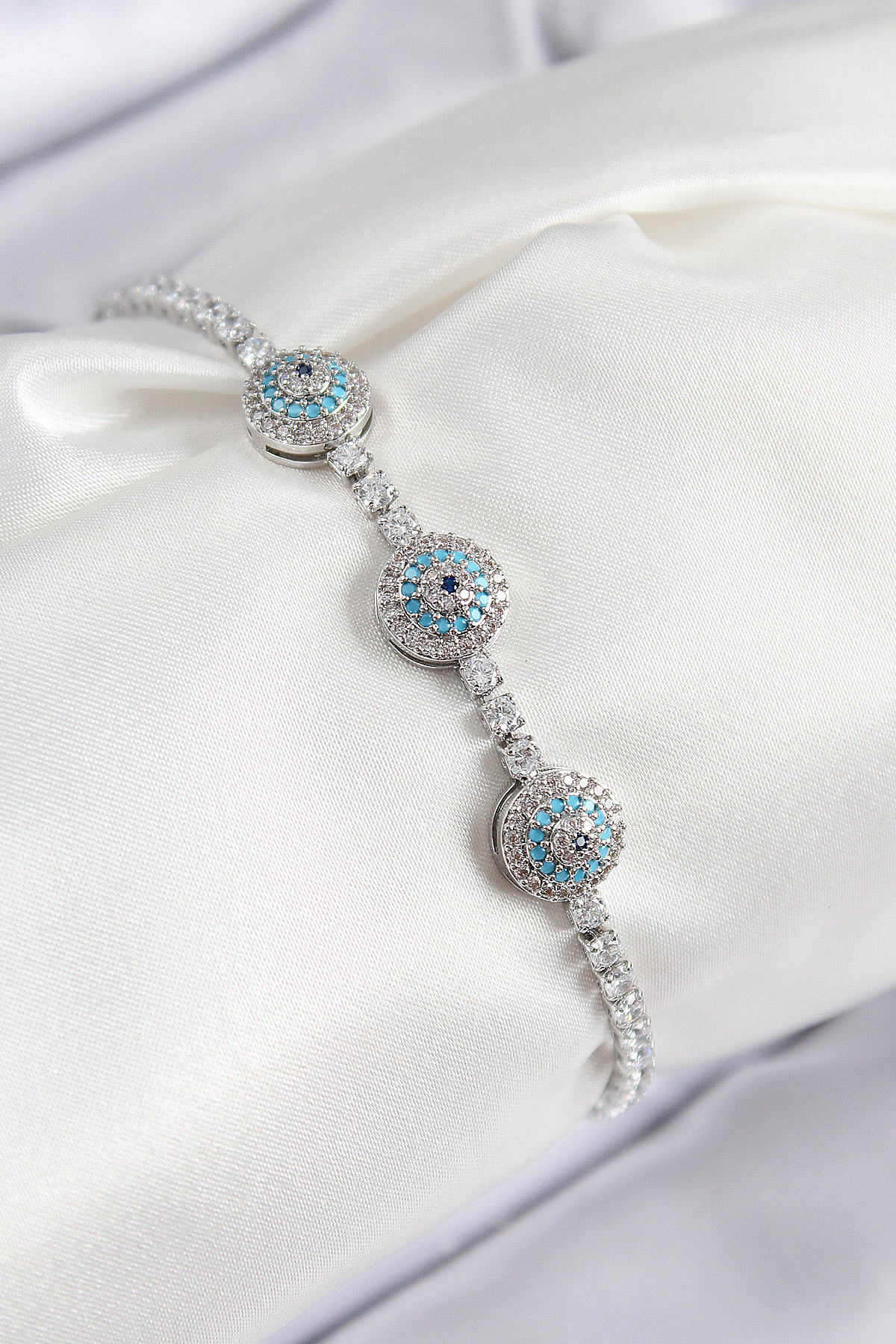 Tegan Pirinç Zirkon Taşlı Nazar Model Gümüş Renk Kadın Bileklik TG27BB7704
