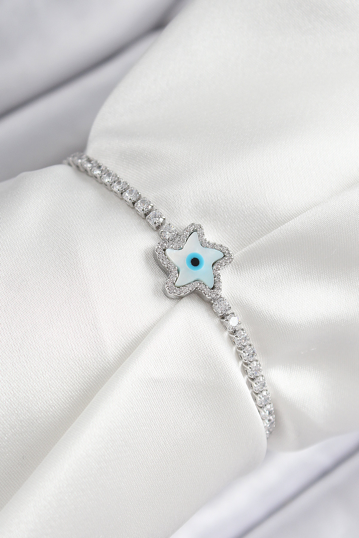 Tegan Pirinç Zirkon Taşlı Nazar Yıldız Model Gümüş Renk Asansörlü Kadın Bileklik TG27BB7469