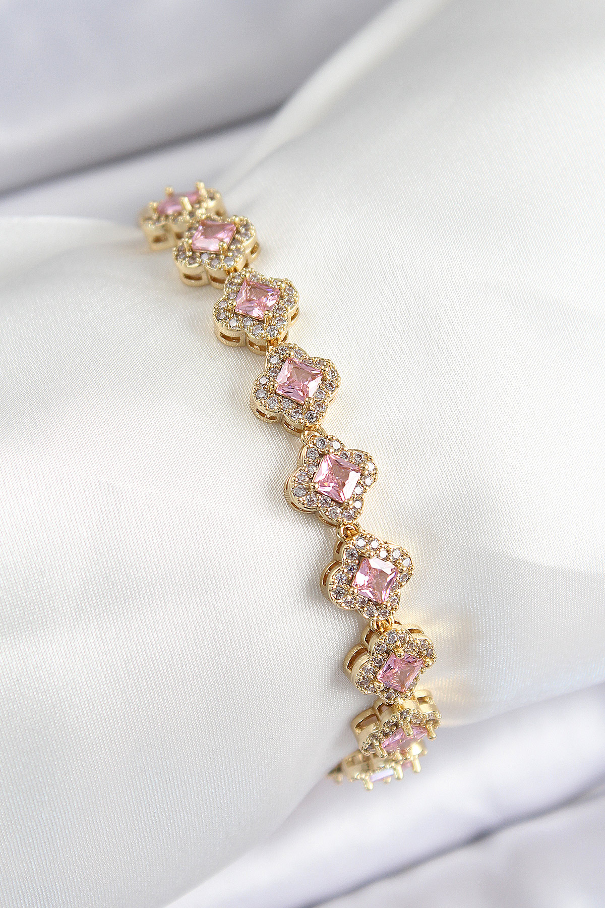Tegan Pirinç Zirkon Taşlı Pembe Yonca Baget Model Gold Renk VIP Seri Kadın Bileklik TG27BB7506