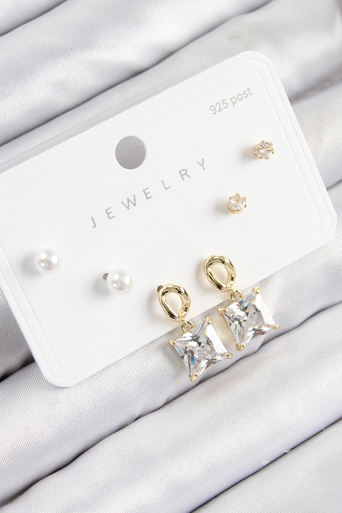 Tegan Pirinç Zirkon Taşlı Sallantılı Kare Model Gold Renk 925 Ayar Gümüş Çivi Kadın Küpe Set TG27BKP11162