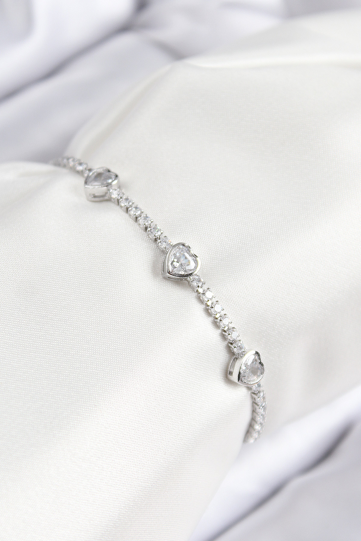 Tegan Pirinç Zirkon Taşlı Sıralı Kalp Model Gümüş Renk Asansörlü Kadın Bileklik TG27BB7728